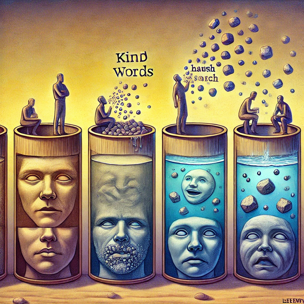 赤ちゃんの頃は10㏄くらいの小さなカップで、毎年少しずつカップが大きくなっていくと思ってください。小学生の頃には500ml、中学生になるころには10Lくらいの容器、高校生の頃には50Lくらいの水槽、大人になるとお風呂の大きさ、そんな感じで大きくなっていくと考えてください。この容器に入っている水は、心を流れています。この水は優しい言葉、愛のある言葉をかけられると、温かくなり、きれいになっていきます。怒鳴られたり、愛のない憎しみがこもった言葉をかけられると、冷たくなり、濁っていきます。小さな目に映るあらゆるものが、母親から伝わってくる温かさが、五感すべてから伝わってくるものが、水に模様をつけていきます。少しずつ少しずつ水質は変化していきます。小さなころは容器が小さいので、ちょっとしたことに敏感です。靴が気に入らない、ランチョンマットが気に食わない、バスに乗る順番が最初じゃなかった等々、大人が些細なことだと感じるようなことでも、幼稚園児は泣き叫びます。これまでの経験がたまった小さな容器に、小さな石が投げ込まれたような感じになり、恐怖や混乱し、泣き叫ぶ。