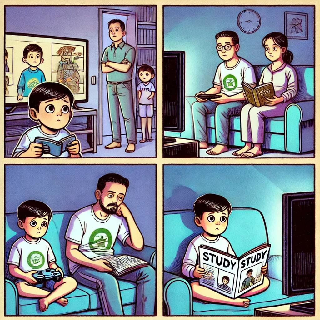 お子さんが家で勉強をしないということをよく聞きますが、そのお子さんに、家でお父さんやお母さんはどうしてると聞くと、テレビをずっと見てるとか、ずっとゲームをしてると答えます。その姿が脳に浸透していくと、自分ものんびりしようとする可能性は高まると思います。子どもは大人のことをよく観察しています。私は道場で本を読んでいるとき、気を付けているつもりですが、だんだん姿勢が悪くなってしまいます。それを生徒が見て、同じような姿勢で本を読んでいるときがあります。その姿を見て、本当に反省させられます。